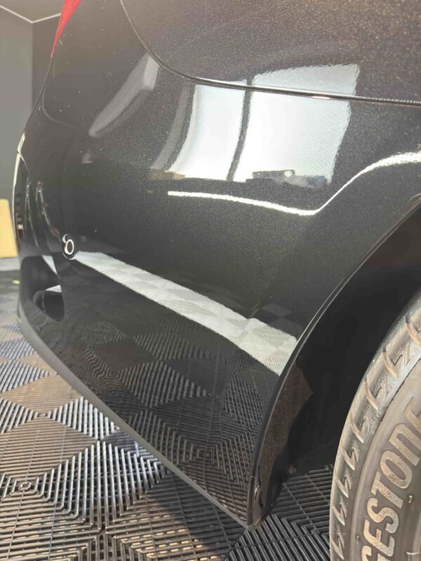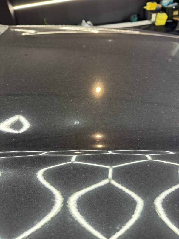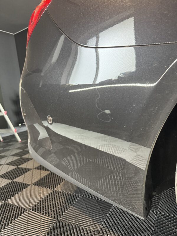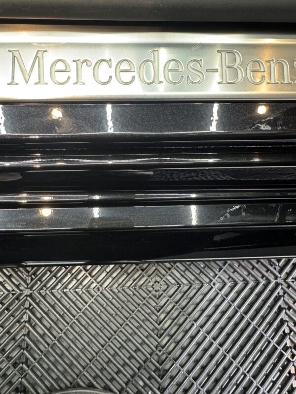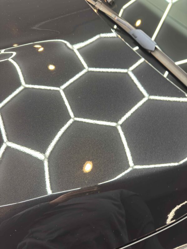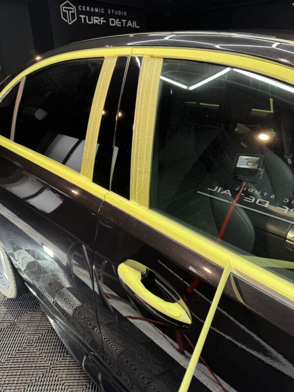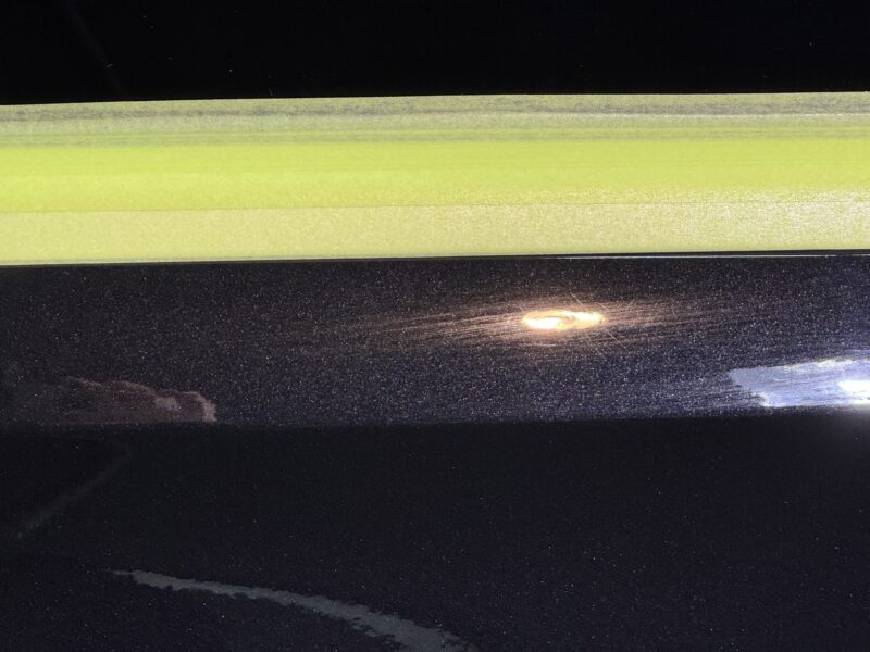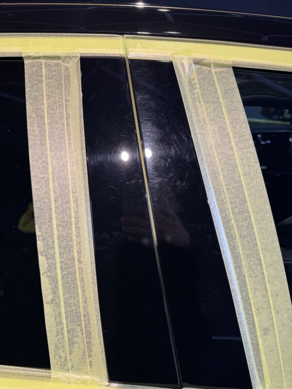 ピアノブラックのピラー部には多方向についた傷があります。普段、洗車をされてないとの事でしたので洗車傷ではなく、日々の使用環境下での直接的なダメージによるものと伺えます。チリや埃などが多量に付着した状態でボディー面に触れると洗車傷以上のダメージがつくのは避けられません。