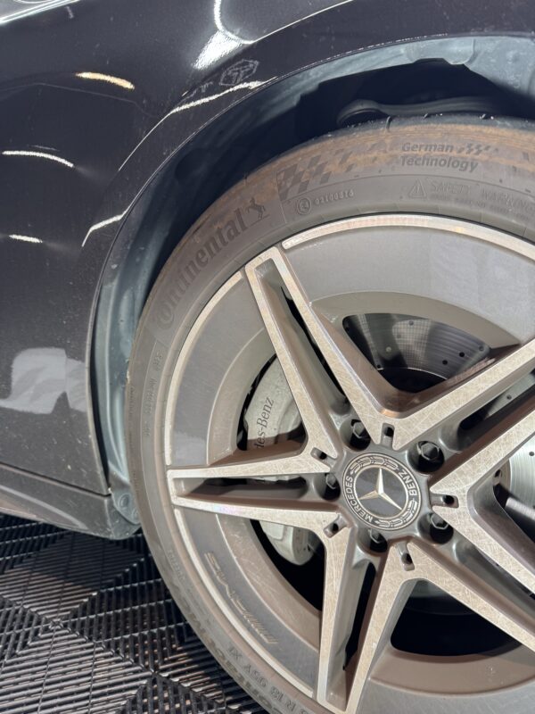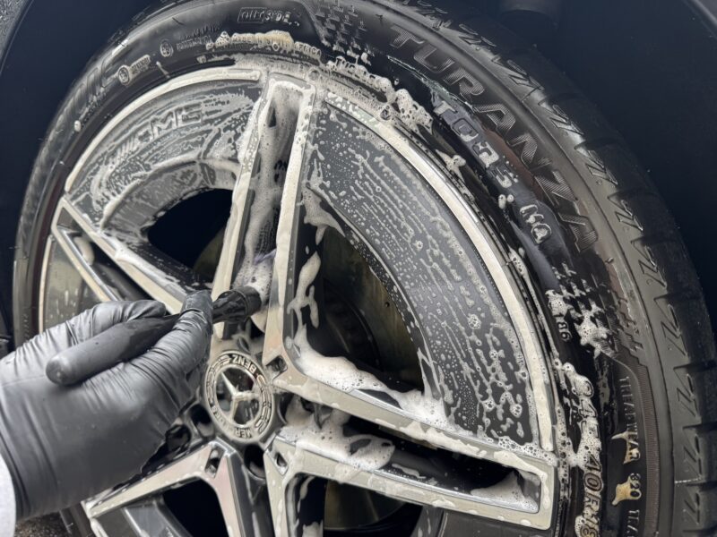 いつも通りホイール洗浄から始めていきます。車輛の唯一の設置面であるタイヤ周辺は有機無機などあらゆる汚れが点在している為、何度も適応のケミカルを変え、洗浄を繰り返し行っていきます。