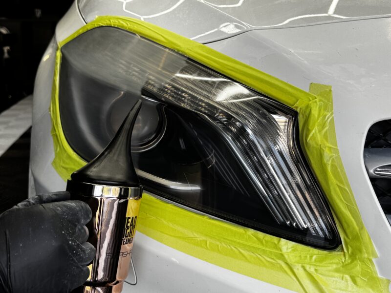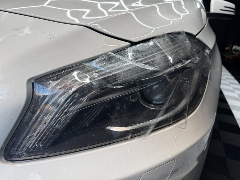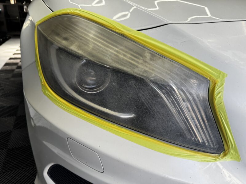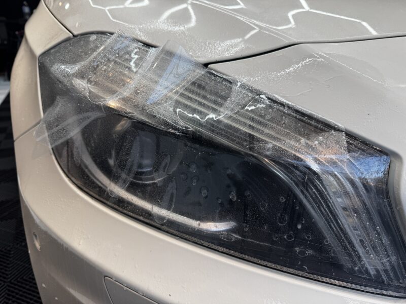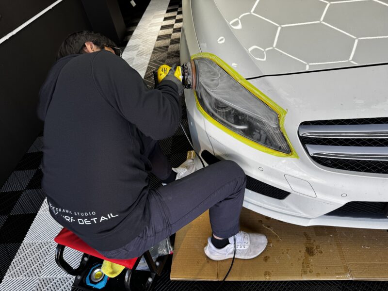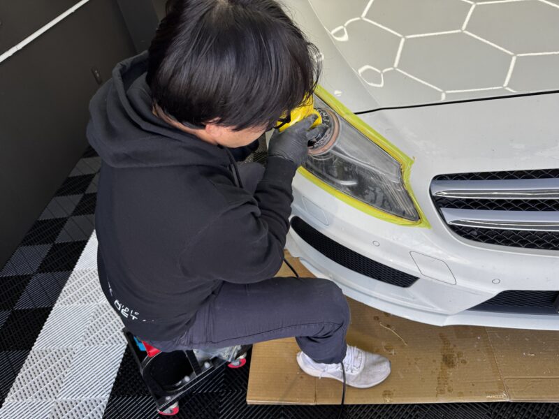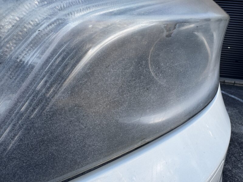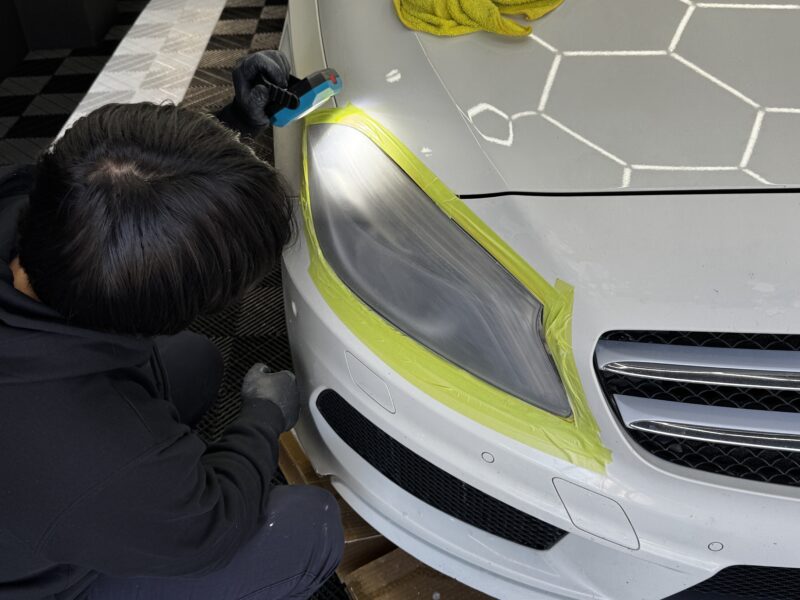 今回はペーパー研磨にてオーバーコート除去をしヘッドライトスチーマーにてポリカーボネートを溶解、フラットにした後、仕上げにプロテクションフィルムにてカバーしていきます。