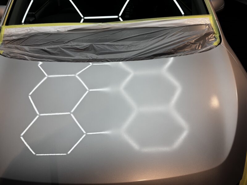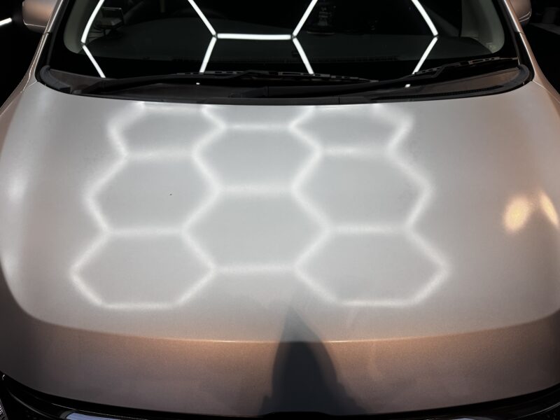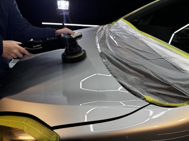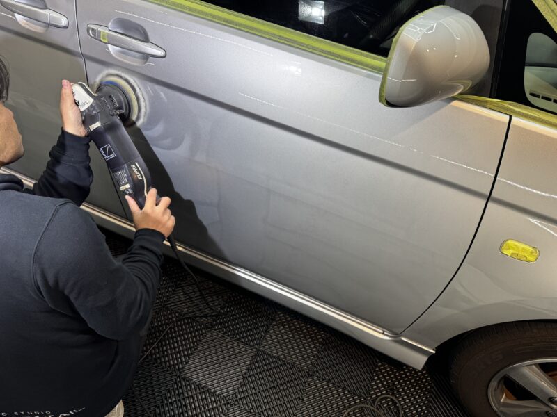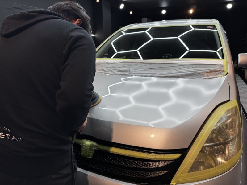 遮光を行い特殊スポットライト下にて塗装面をしっかり確認し、丁寧に磨き上げていきます。先程確認したミストはありませんが深傷や付着物の除去は確認できます、塗装面を平滑にしながら塗装自体の光沢を引き上げ、コーティングに最適な下地へと整えていきます。