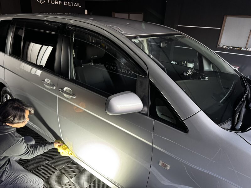 照明などを一時的にあらゆる光と角度で最終チェックしていきます。ターフプレミアムのコーティング剤は初期硬化が始まってしまうと拭き取り不可のため環境と確認は必要事項となります。