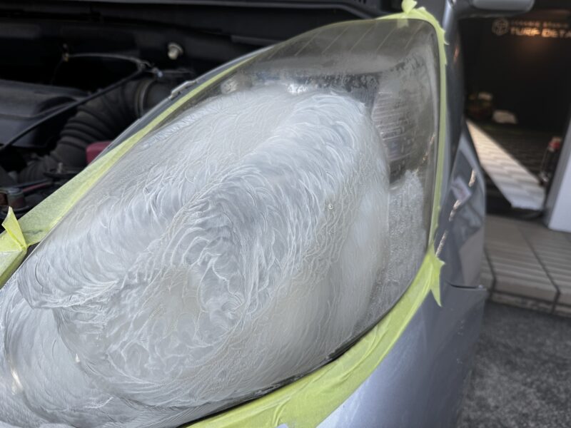 通常通りサンドペーパーからの順を追って変色したヘッドライトを復元加工していきます、紫外線等の影響により劣化が進みサンドペーパーによる磨きカスが変色しているのがわかります。